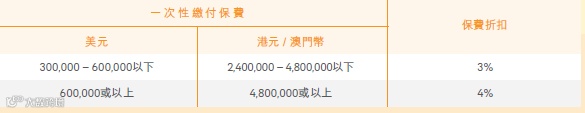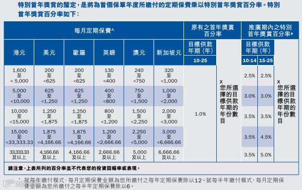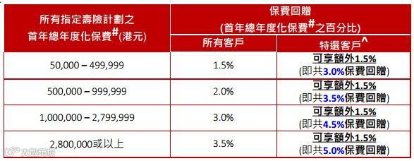 客户凡成功投保任何指定寿险计划*首年总年缴保费达以下指定金额,可享高达3.5%首年总年度化保费回赠。特选客户^更可享额外1.5%首年总年度化保费回赠,即合共可享高达5%保费回赠。