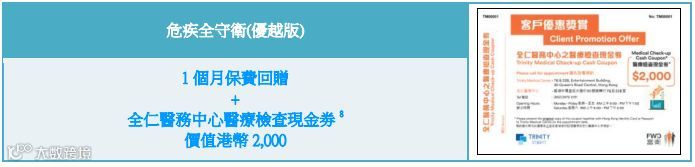 现凡投保全新身心卫危疾保障计划,即可享2个月保费回赠!投保危疾全守卫(优越版)计划即享1个月保费回赠附加全仁医务中心检查现金券!