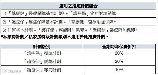 于推广期内同时成功投保「挚康健」医疗保障计划及「護痊保」癌症保障计划(请参考一下计划组合要求),保障期内可尊享「護痊保」癌症保障计划全期保费折扣,每年保费折扣高达20%