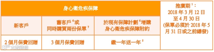 投保全新指定医疗及保障基本计划及/或附加契约并符合表三之总首年年缴保费要求,即有机会获享高达1.5个月保费回赠或DysonHot+Cool 风扇暖风机一部。