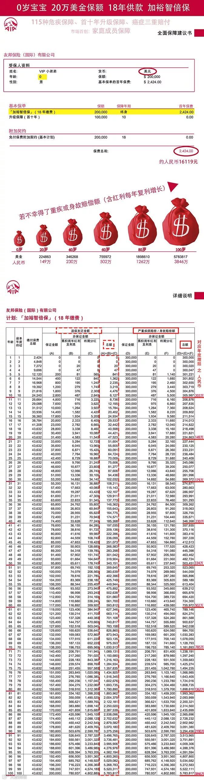详情见以下“0岁宝宝案例说明”(截取计划书之重点信息用彩色标注,并用1:6.65将美金换算为人民币)