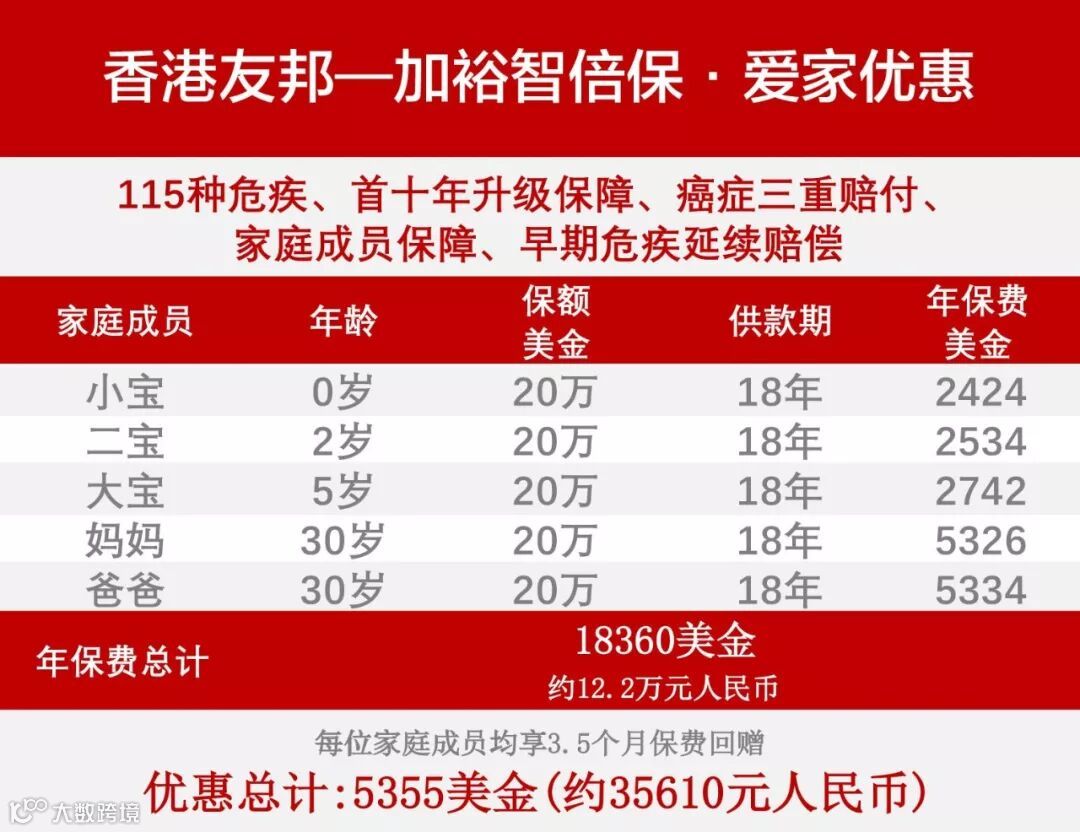 以5位家庭成员同时投保为例,每位成员20万美金保额可享3.5个月保费回赠,即5位家庭首年总保费由1.8万美金下降至1.3万美金(约8.6万人民币);可为每位家庭成员获得高达20万美金保额,且首十年赠送50%保额,即每位成员30万美金(约200万人民币)的高额保障。
