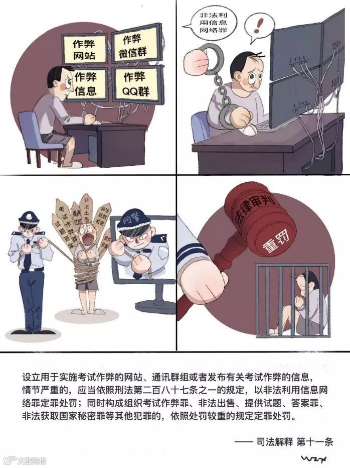 《中华人民共和国刑法》明确规定,在法律规定的国家考试中,“组织作弊的”“为他人提供作弊器材或者其他帮助的”“向他人非法出售或者提供考试的试题、答案的”“代替他人或者让他人代替自己参加考试的”,都属于违法犯罪行为。