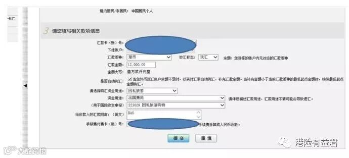 是否自动购汇:一般个人账户无外币存款,需选自动购汇(即自动用人民币购买港币汇往香港的个人账户)。