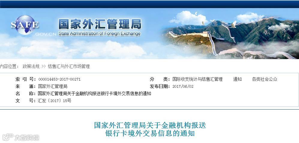 《国家外汇管理局关于金融机构报送银行卡境外交易信息的通知》全文