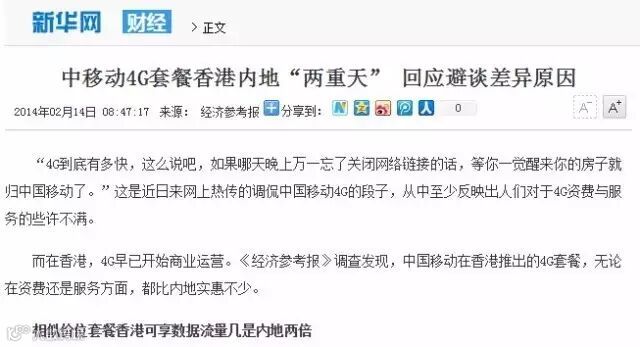 我想先讲一件陈年旧事,其实也就是2014年的新闻,中国移动(香港)推出的4G“逆天”套餐的新闻,当时也是一件热点。
