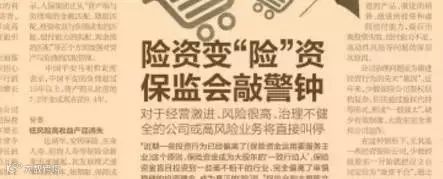 “近期一些投资行为已经偏离了(保险资金运用要服务主业)这个原则,保险资金成为大股东的‘一致行动人’,保险资金盲目投资到一些毫不相干的行业,完全偏离了审慎稳健的投资理念,成为真正的‘险’资。”保监会副主席陈文辉昨日发表署名文章,再次强调行业风险。