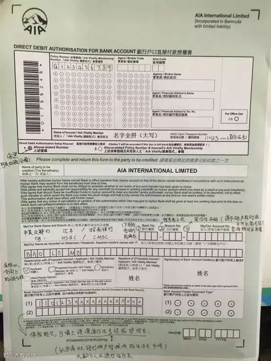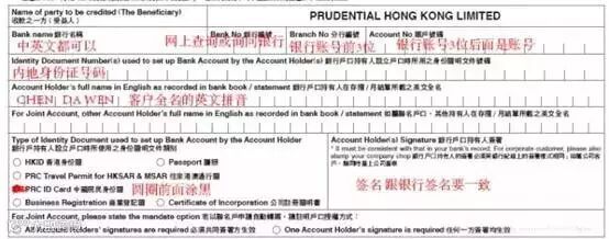 以上文件签字完毕,复印身份证 和香港银行卡邮寄到香港保险公司即可,关于如何填写有几点要注意: