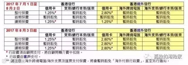 从8月3日起,客户通过海外信用卡支付方式缴纳香港保险费用时,需缴付2.8%的手续费。海外跨境电汇,香港和海外的支票/银行本票/汇票缴付整付保费、首期保费和续保保费的行政费可获暂时豁免相关费用,直至另行通知为止为准。