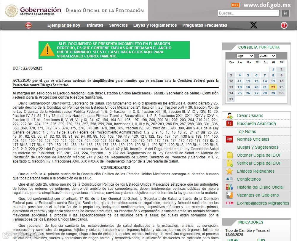 2025年8月22日,COFEPRIS发布《关于简化联邦健康风险防范委员会程序的协议》(刊登于墨西哥《联邦官方公报》DOF,以下简称协议 ),该协议对医疗器械、药品等相关产品办理注册的流程、优化材料、压缩审评时限做出系统性调整,并设置明确的过渡期与信息化要求。