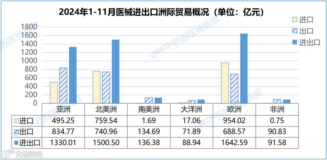 从2024年1-11月总体数据来看,中国器械贸易主要集中在欧洲、北美洲,分别占比达34.29%、31.33%,贸易总额分别为1,642.59,亿元、1,500.50亿元。其中,出口方面,亚洲出口金额占比第一,达32.59%,出口金额为834.77亿元,环比下降2.75%;进口方面,欧洲进口金额占比第一,达42.81%,进口954.02亿元,环比下降5.58%。