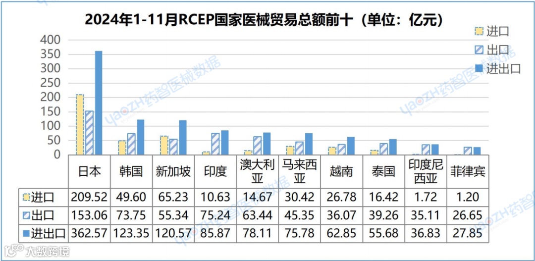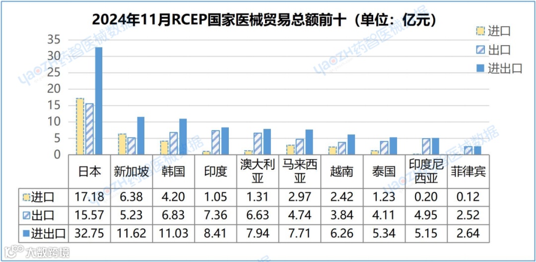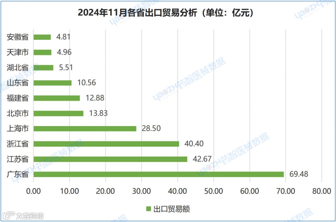 从2024年11月单月数据来看,出口方面,2024年11月亚洲市场为最大出口贸易市场,市场份额占比达32.84%。2024年11月中国对RCEP国家、“一带一路”和东盟出口总额分别是62.83亿元、68.17亿元、25.78亿元;相比2024年10月,RCEP国家增长17.17%,“一带一路”增长11.6%,东盟增长27.99%。2024年11月中国医疗器械的主要出口地为美国、日本、德国,美国为中国最大的出口贸易国家,占中国出口市场的25.84%。2024年11月中国出口医疗设备的金额占比最高,达43.62%。中国医疗器械对外贸易中,广东省为出口额最大的省份,2024年11月出口额为69.48亿元。