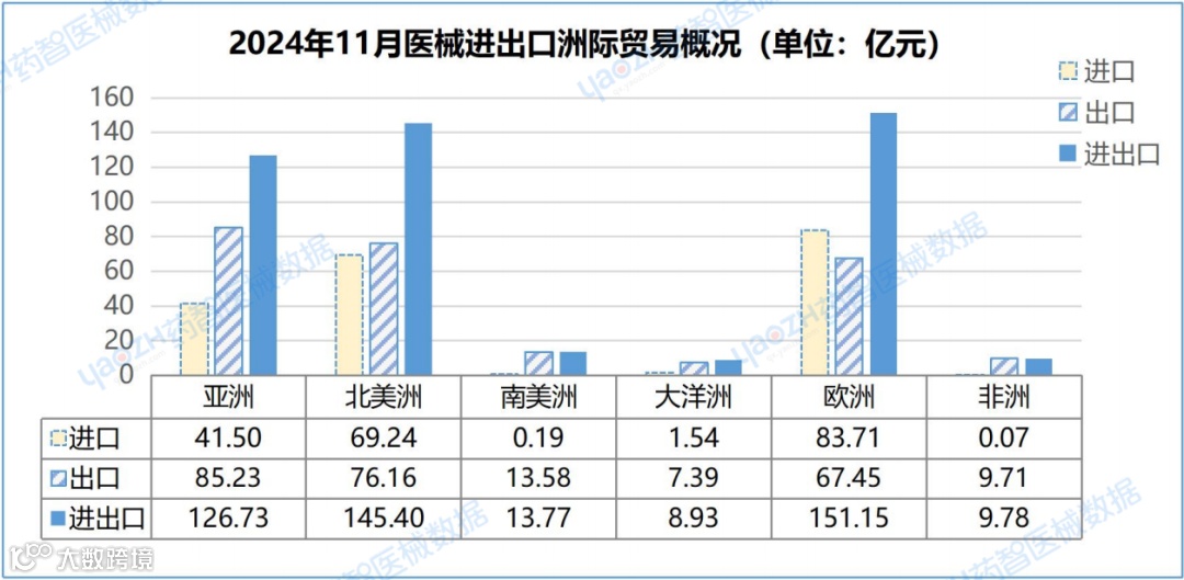 2024年11月,中国器械贸易主要集中在欧洲、北美洲,分别占比达33.16%、31.90%,贸易总额分别为151.15亿元、145.40亿元。其中,出口方面,亚洲出口金额占比第一,达32.84%,出口金额为85.23亿元,环比增长16.19%;进口方面,欧洲进口金额占比第一,达42.65%,进口83.71亿元,环比下降0.5%。