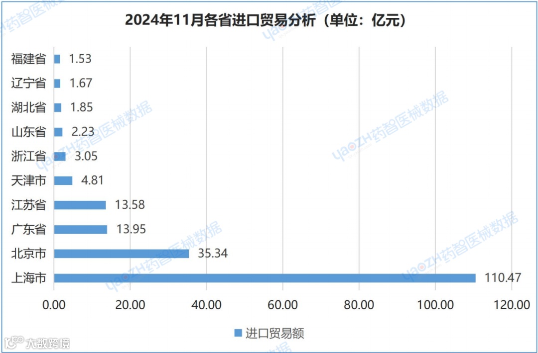 进口方面,2024年11月欧洲市场为最大进口贸易市场,市场份额占比达42.65%。2024年11月中国医疗器械的主要进口地为美国、德国、日本,美国为中国最大的进口贸易国家,占中国进口市场的22.73%。2024年11月中国进口医疗设备的金额占比最高,达44.92%。中国医疗器械进口贸易中,上海市为进口额最大的省份,2024年11月进口额为110.47亿元。
