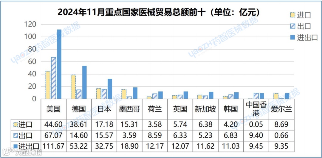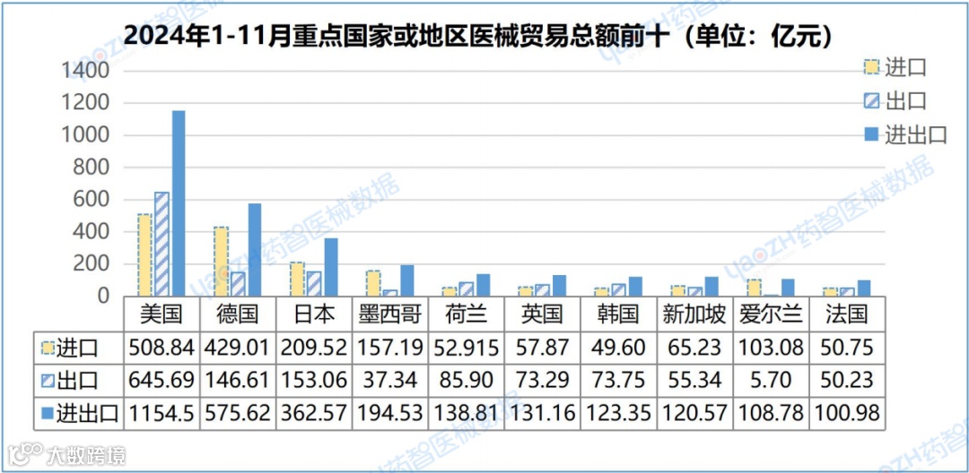 从2024年1-11月总体数据来看,中国医疗器械的主要贸易伙伴为美国、德国、日本、墨西哥、荷兰,其进出口贸易总额为2,426.0,7亿元,占中国全球总贸易额50.65%,环比下降2.88%。其中出口贸易总额为1,068.59亿元,占中国总出口额41.71%,环比增长4.32%。进口贸易总额为1,357.47亿元,占中国总进口额60.92%,环比下降7.88%。