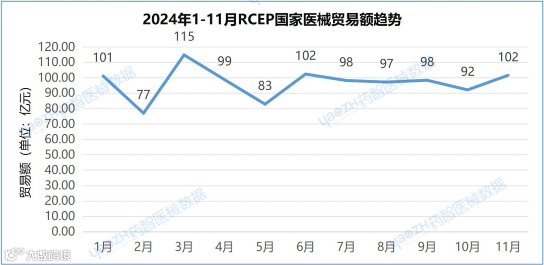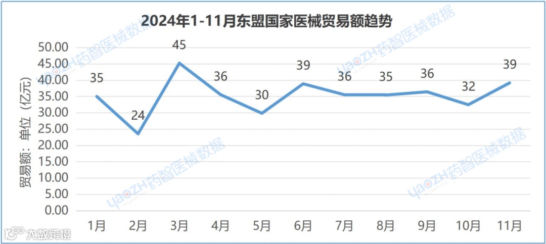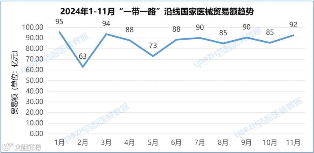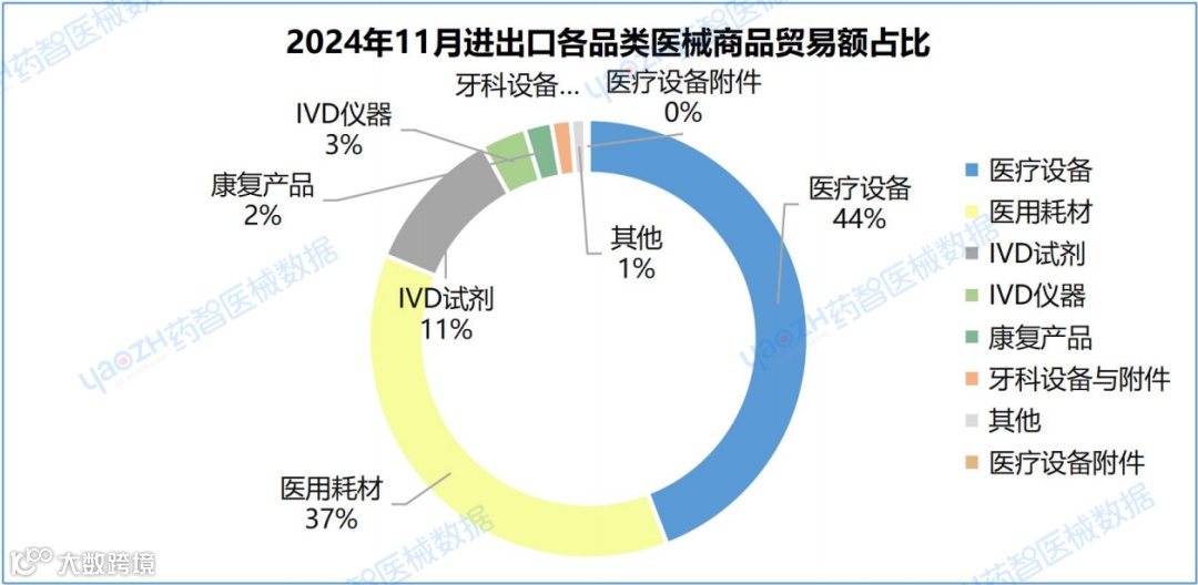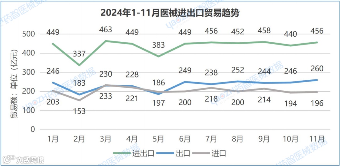 从主要产品总贸易额数据来看,2024年1-11月,医疗设备与医用耗材趋势大致相同,均在2024年2月、5有明显回落,而后上升。
