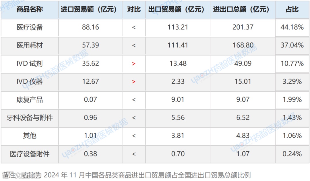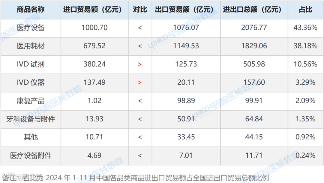 1、2024年1-11月中国进出口各品类医械商品贸易额顺逆差详情