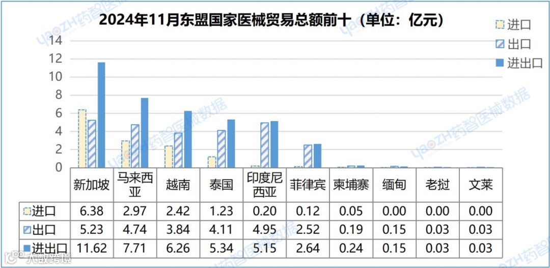 2024年11月,中国对东盟国家进出口39.15亿元,占中国全球贸易总额8.59%,环比增长20.64%。其中,出口25.78亿元,占中国总出口额9.94%,环比增长27.99%;进口13.3668亿元,占中国总进口额6.81%,环比增长8.62%。对新加坡、马来西亚、越南分别进出口11.62亿元、7.71亿元、6.26亿元,占同期中国对东盟国家进出口总值65.35%。
