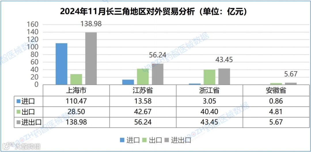 从长三角地区进出口贸易额分析,2024年11月医疗器械进出口总贸易额为244.34亿元,占中国进出口总贸易额53.61%。