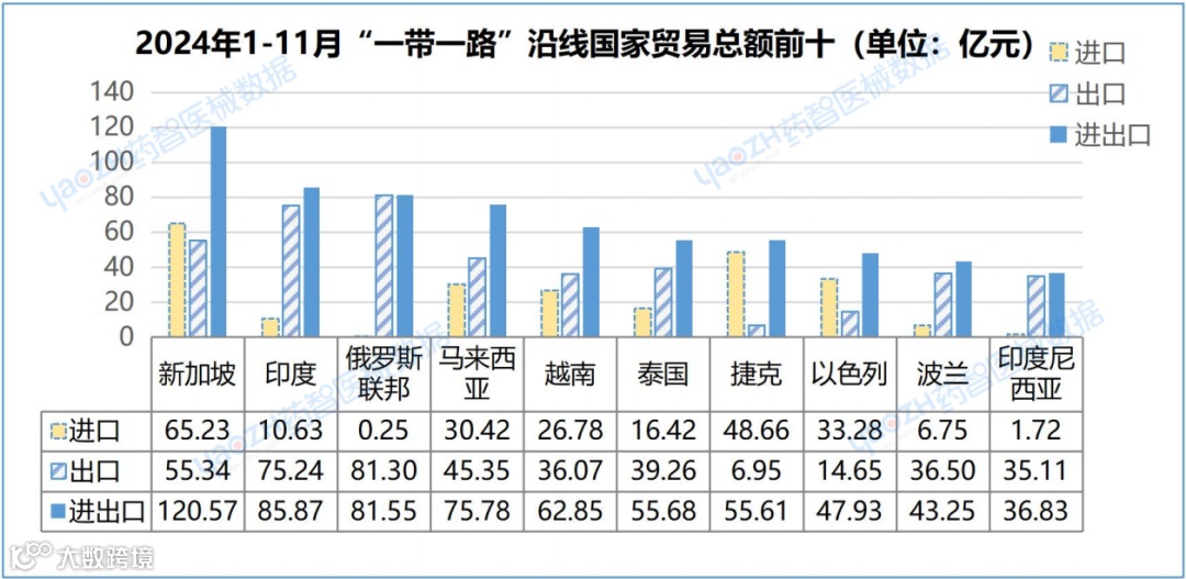 2024年1-11月,中国对“一带一路”沿线进出口944.06亿元,占中国全球贸易总额19.71%,环比增长0.36%。其中,出口666.86亿元,占中国总出口额26.03%,环比增长1.22%;进口277.20亿元,占中国总进口额12.44%,环比下降1.64%。对新加坡、印度、俄罗斯联邦、马来西亚、越南分别进出口120.57亿元、85.87亿元、81.55亿元、75.78亿元、62.85亿元,占同期中国对“一带一路”沿线国家进出口总值45.19%。