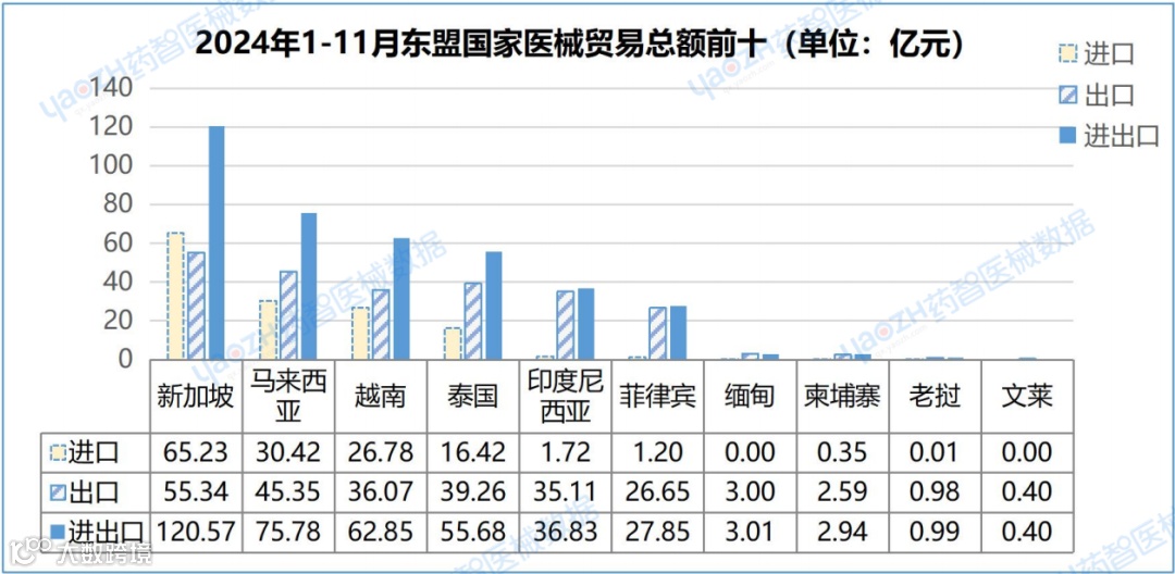 从2024年1-11月总体数据来看,中国对东盟国家进出口386.90亿元,占中国全球贸易总额8.08%,环比下降3.22%。其中,出口244.76亿元,占中国总出口额9.55%,环比增长0.02%;进口142.13亿元,占中国总进口额6.38%,环比下降8.34%。对新加坡、马来西亚、越南分别进出口120.57亿元、75.78亿元、62.85亿元,占同期中国对东盟国家进出口总值66.99%。