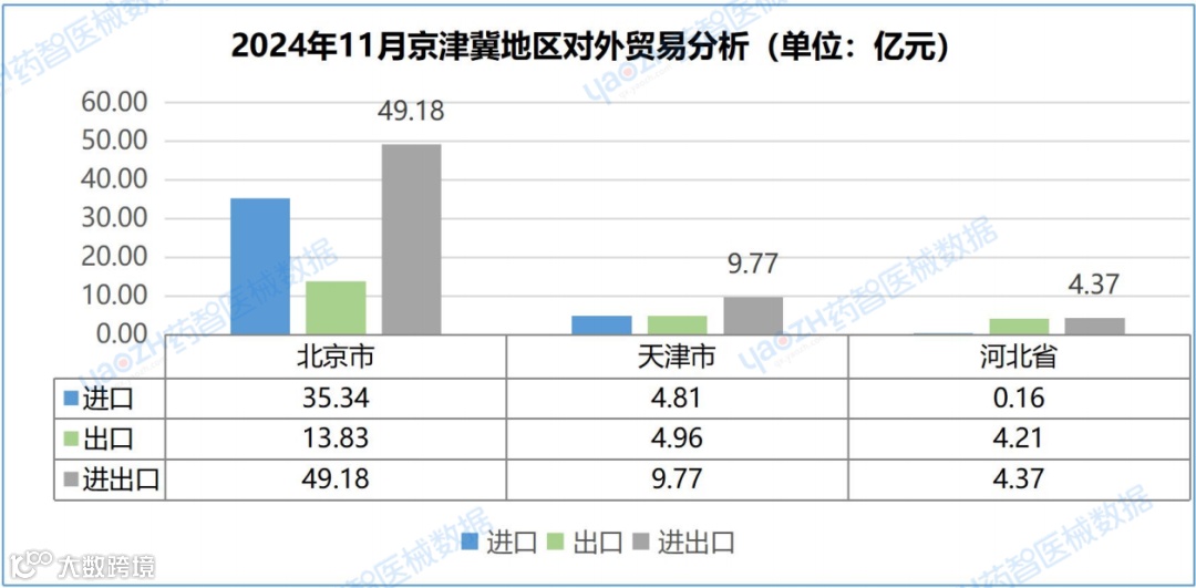 从京津冀地区进出口贸易额分析,2024年11月医疗器械进出口总贸易额为63.32亿元,占中国进出口总贸易额的13.89%。