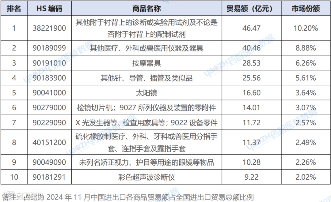 2、2024年11月中国医械进出口贸易额排名前十各商品信息详情