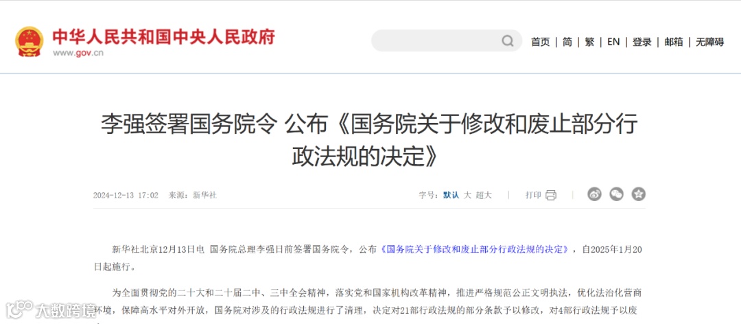 2024年12月13日,国务院发布了《关于修改和废止部分行政法规的决定》(第797号),其中对《医疗器械监督管理条例》、《病原微生物实验室生物安全管理条例》进行了修改,并于2025年1月20日起施行。