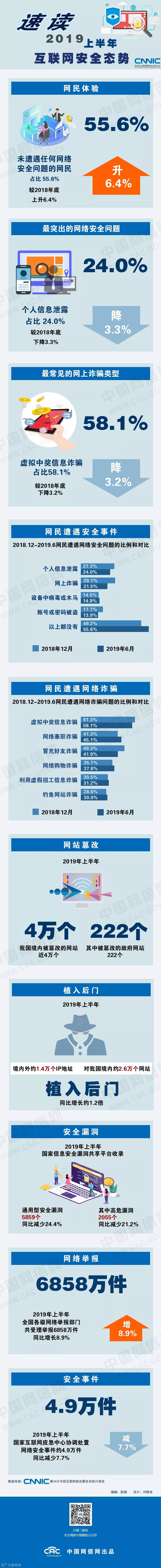 导读:数据显示,55.6%的网民表示过去半年在上网过程中未遭遇过网络安全问题,较2018年底提升6.4个百分点。