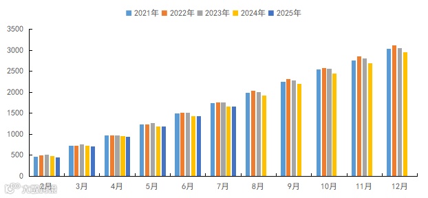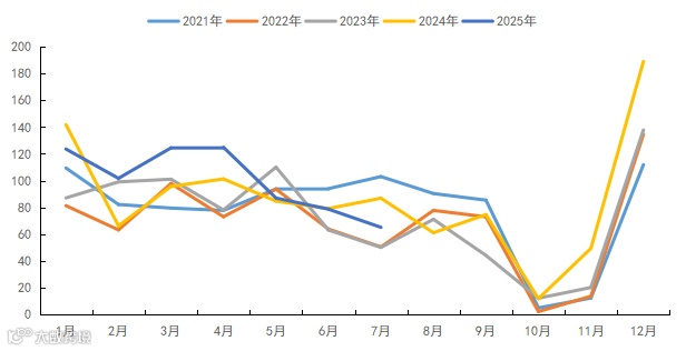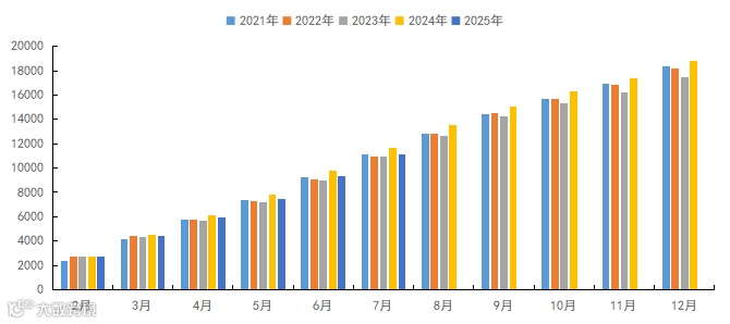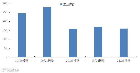 2024/25年制糖期全国共生产食糖1116.21万吨,同比增加119.89万吨,增幅12.03%。截至7月底,全国累计销售食糖为955万吨,同比增加130万吨,增幅15.7%;累计销糖率85.6%,同比增长2.7%。7月全国销售食糖65万吨,同比下降21.8万吨,同比降幅25.12%。工业库存方面,截至7月底,2024/25榨季国内糖厂工业库存为161万吨,同比减少10万吨,降幅5.8%。从近5个榨季截至7月底的工业库存来看,最高值为20/21榨季280.49万吨,最低值为22/23榨季的159万吨,近5个榨季的平均值为203.49万吨。2024/25榨季截至7月底的食糖工业库存低于历史均值水平。
