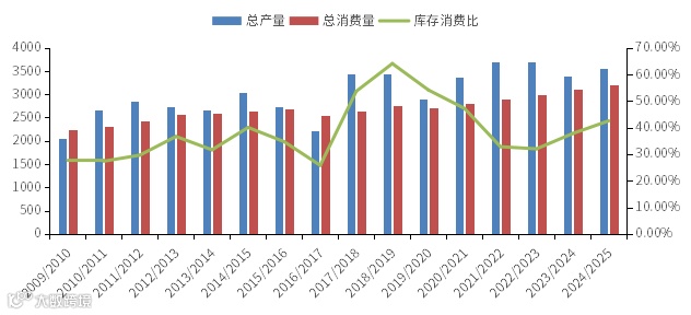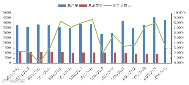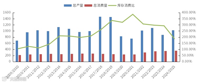 就全球食糖供需格局而言,因印度、泰国增产及巴西产量维持高位,分析机构StoneX预计2025/26年度全球食糖产量为1.977亿吨,同比增加5%,期末库存预计达到7540万吨,同比增长4.2%;需求方面,过去五年全球食糖需求增速放缓至0.7%。在欧洲人口消费量减少的同时,美国和巴西等食糖消费大国的消费量则保持稳定。StoneX将2025/26年度的预估需求量下调40多万吨,至1.947亿吨,年增长率为0.7%。2025/26年度全球食糖预计供应过剩304万吨,较5月预估削减70万吨。不过目前全球食糖库存处于偏低水平,将为ICE原糖提供一定支撑。