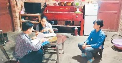 2018年9月17日晚,黄文秀(中)带领驻村工作队到广西乐业县新化镇百坭村者乐屯贫困户廖家国的家中开展入户走访工作。黄韦程 摄
