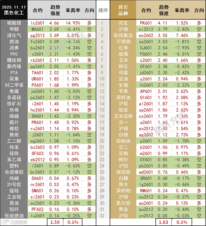 中期商品趋势榜 | 碳酸锂、花生、液化气、欧线集运多头强势 沪镍、甲醇空头强势(1117)