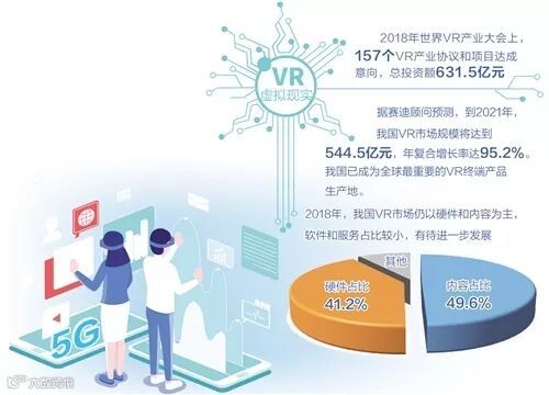 业界预估,虚拟现实将撬动上万亿元市场。当前,我国已成为全球最重要的虚拟现实终端产品生产地,歌尔、小米、Pico等公司的虚拟现实终端产品出货量位居全球前列。但值得注意的是,2018年我国虚拟现实市场仍以硬件和内容为主。其中,内容占比最高,为49.6%;硬件紧随其后,占比41.2%;软件和服务占比较小,有待进一步挖掘潜力。