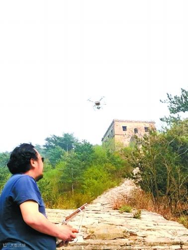 箭扣长城修缮工程的设计师使用无人机对长城进行飞行勘察。北京晚报 张航摄