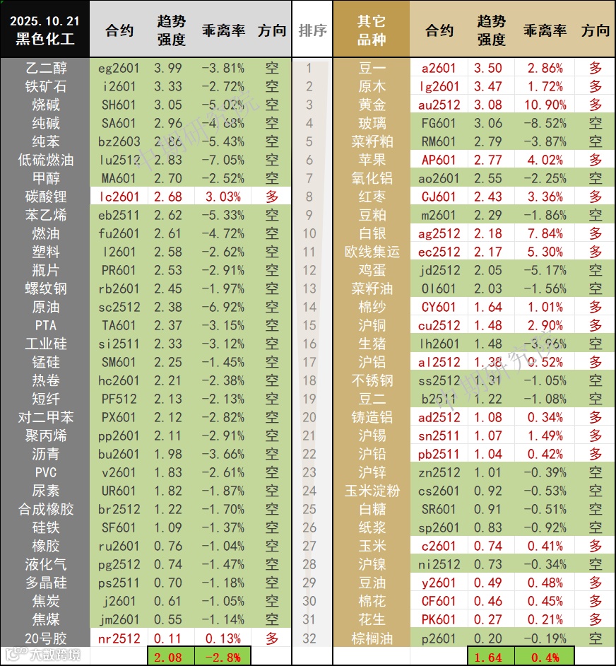 中期商品趋势榜 | 豆一、原木、黄金多头偏强   黑色化工、玻璃空头偏强(1021) 中国国际期货福建分公司