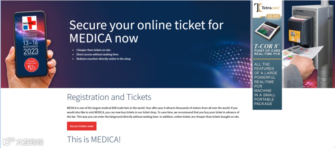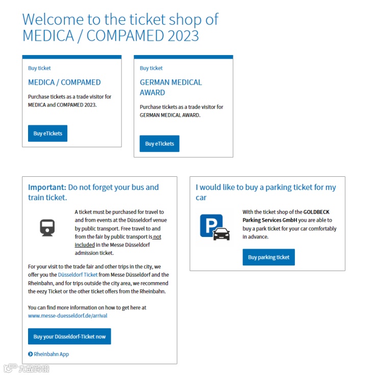 通过➜MEDICA官网:https://www.medica-tradefair.com/en/Visit/Preparation/Tickets_vouchers购票,购买MEDICA/COMPAMED联票、德国医院日大会门票和德国医学奖颁奖典礼门票等。