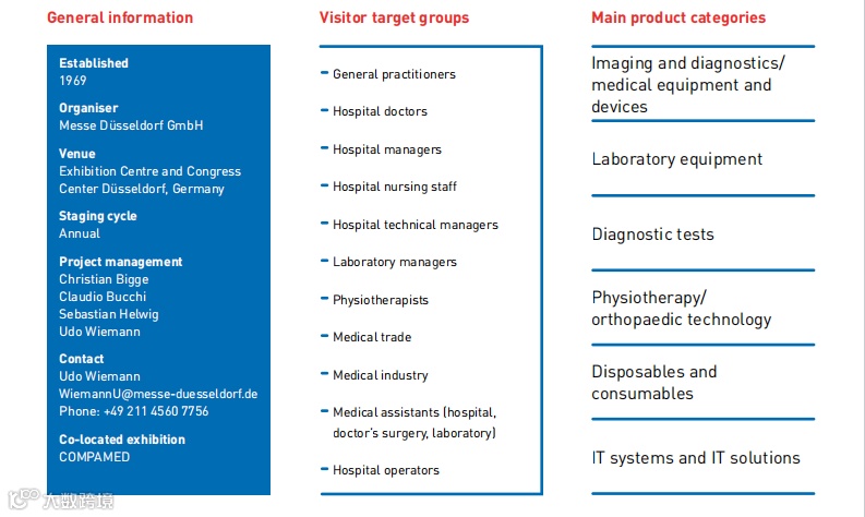 德国杜塞尔多夫医疗设备展览会(MEDICA),是世界上最大的医疗B2B贸易展览会之一,被公认为世界上最大的医院及医疗设备展览会,以其不可替代的规模和影响力位居世界医疗贸易展的首位。