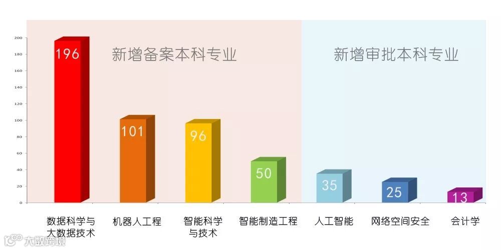 2. 教育:根据2019年3月教育部网站数据,2018年度,全国各大高校新增备案本科专业最多的是:数据科学与大数据技术(196所)、机器人工程(101所)、智能科学与技术(96所)、智能制造工程(50所)。新增审批本科专业最多的是:人工智能(35所)、网络空间安全(25所)、会计学(13所)。大数据作为新兴领域,在新增专业数量上独占鳌头,由此可见,我国对于大数据人才的培养十分重视。