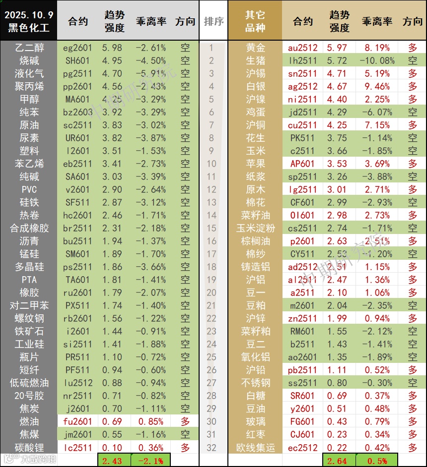 中期商品趋势榜 | 黄金、沪锡、白银、沪镍、沪铜多头强势 乙二醇、生猪空头强势(1009)