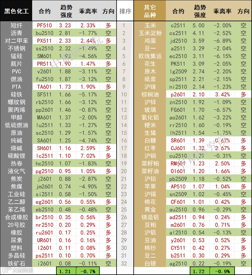 中期商品趋势榜 | 玉米、淀粉、鸡蛋、豆一、欧线集运空头强势 短纤多头偏强(0821)