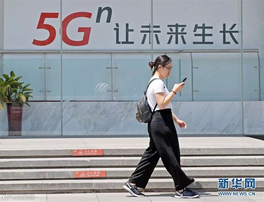 6月3日,在北京西单,一名女子从一块5G广告牌前走过。新华社记者 才扬 摄
