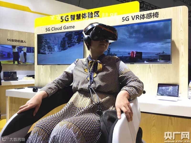 戴上VR眼镜,观众在5GVR体感椅上进行体验。体感椅能够模拟车船,通过震动、摇摆等方式让坐在椅子上的观众有身临其境之感。央广网记者 褚夫晴 摄