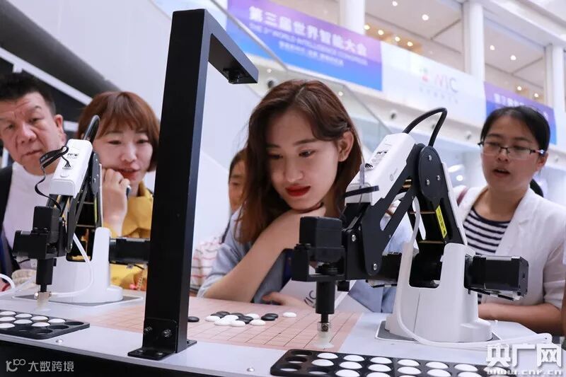 在第三届世界智能大会科技展上,观众与机器人进行五子棋比赛,机器人有条不紊地与市民进行对决。(央广网记者 刘阳 摄)