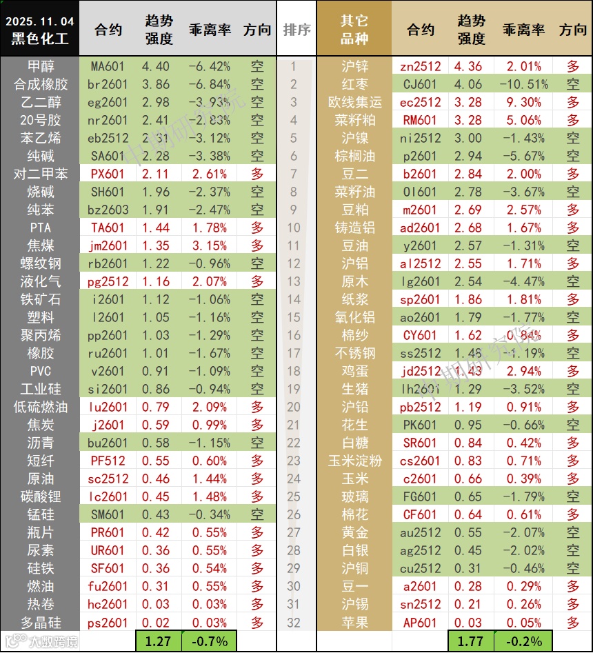 中期商品趋势榜 |沪锌、欧线集运多头偏强 甲醇、红枣、合成橡胶空头强势 (1104)