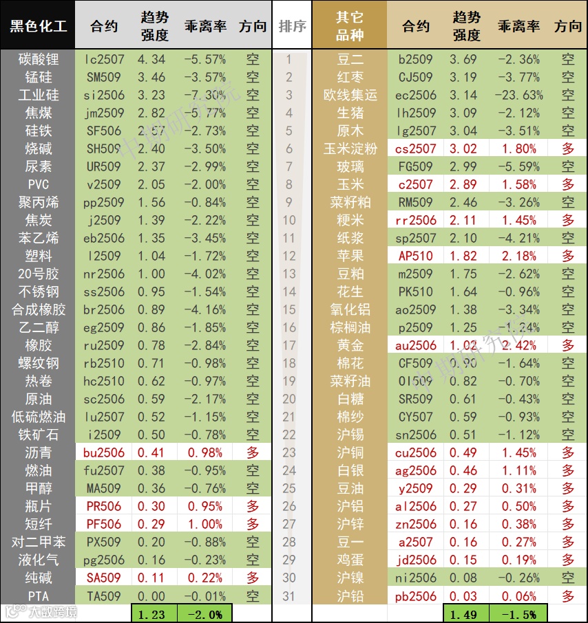 中期商品趋势榜 | 碳酸锂、豆二、锰硅、工业硅空头持续强势 玉米淀粉、玉米多头偏强 (0429)