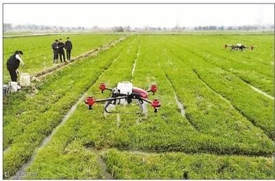 2月26日,浙江省诸暨市山下湖镇新桔城村的诸暨市伟可粮食专业合作社200多亩小麦田里,两架植保无人机进行杂草防治喷药。徐德文摄(人民图片)