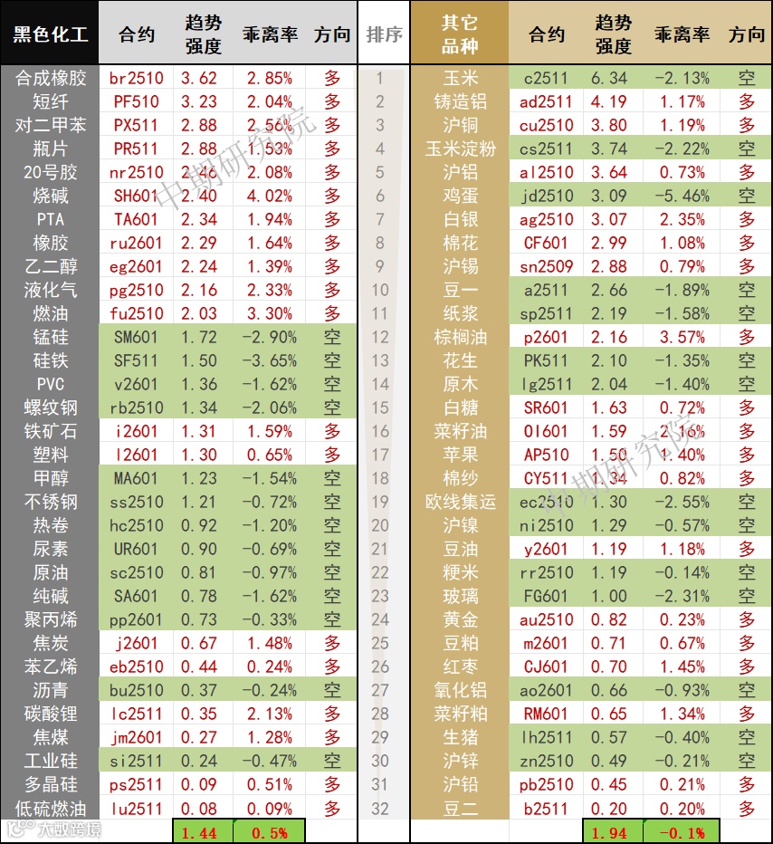 中期商品趋势榜 | 玉米、淀粉、鸡蛋空头强势  铸造铝、沪铜、沪铝、合成橡胶多头偏强(0825) 中国国际期货福建分公司