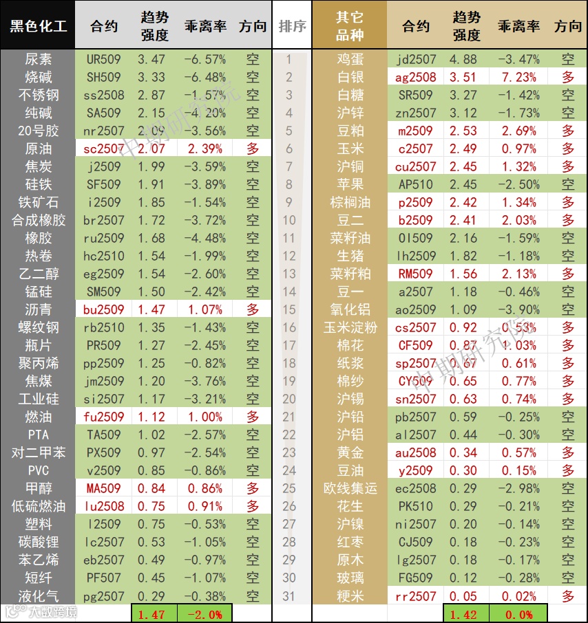 中期商品趋势榜 | 鸡蛋、尿素、烧碱、白糖、沪锌空头偏强 白银多头强势(0609)