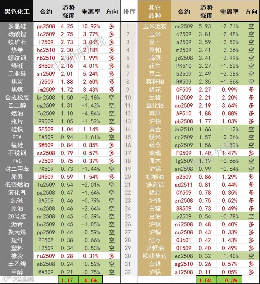 中期商品趋势榜 | 淀粉、玉米、豆一、豆粕、鸡蛋、花生空头强势 多晶硅多头强势(0707)